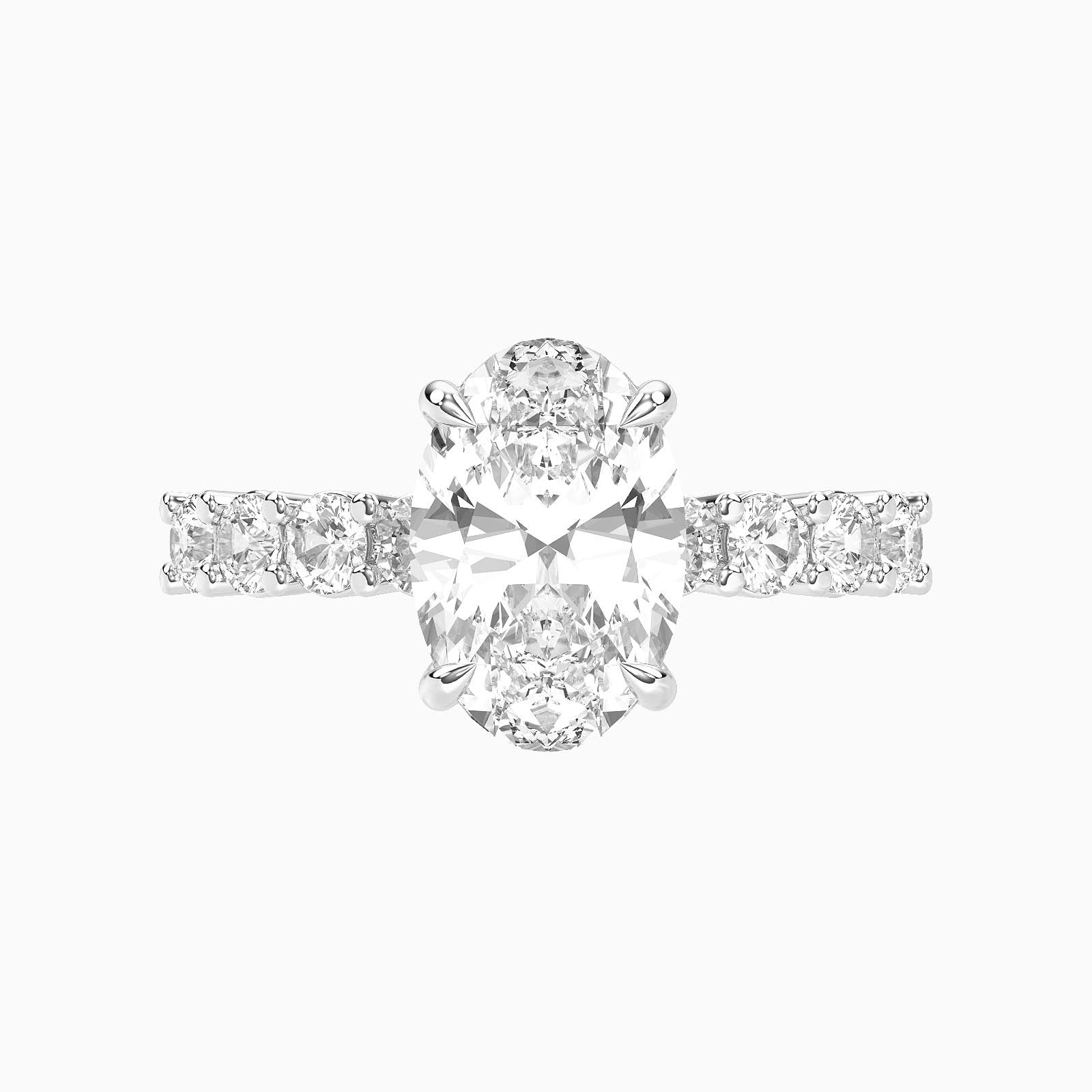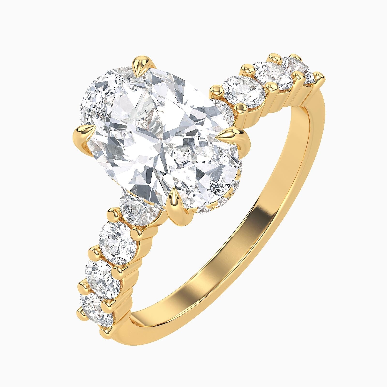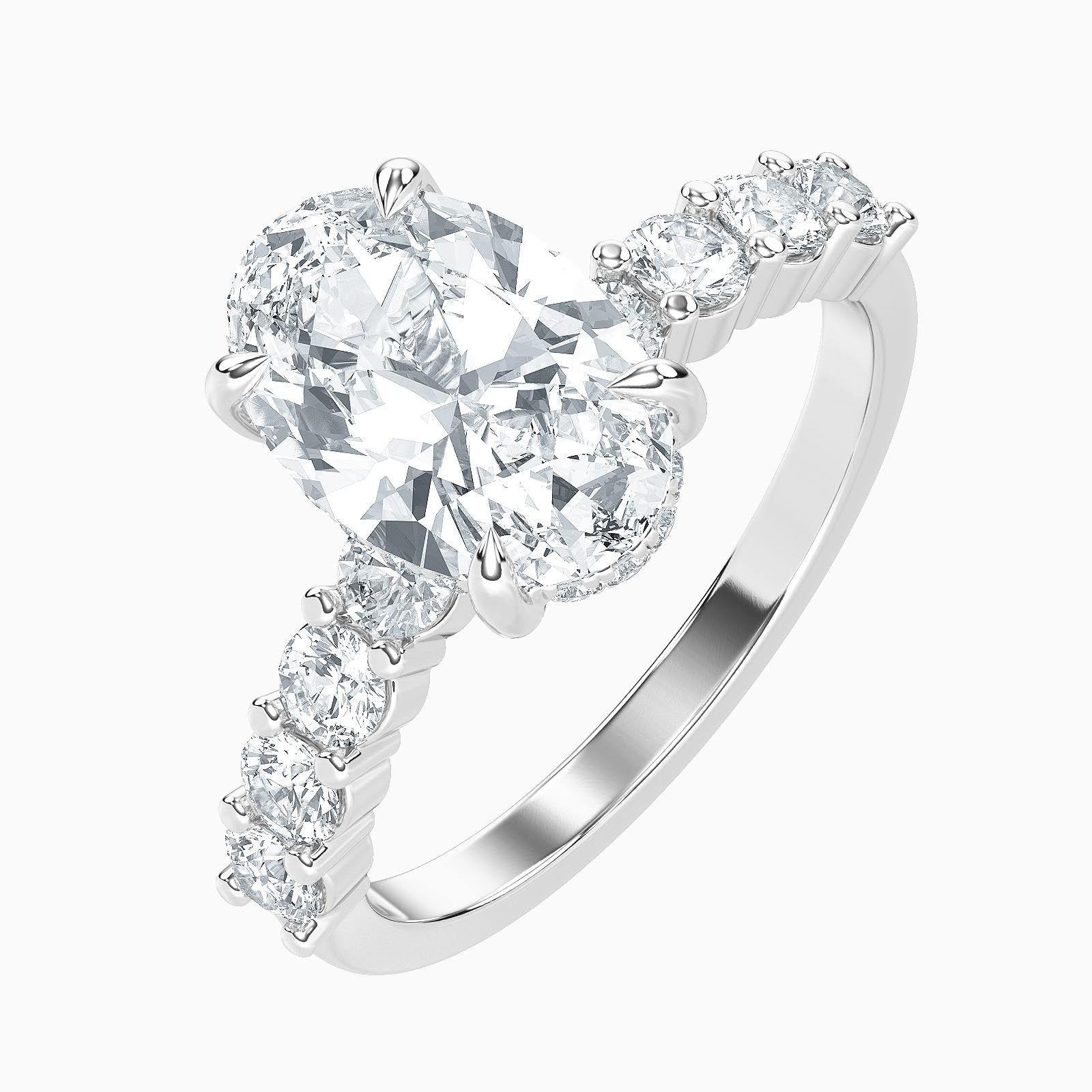 Carat Weight Total: 3.30 CT Metal: 14K / 18K White, Yellow, or Rose Gold Average Width: 1.85 mm Ring Style: Oval Solitaire with Side Stones Center Stone Carat Weight: 2.49 CT Center Stone Shape: Oval Center Stone Color: F Center Stone Clarity: VS1 Center Stone Cut: Excellent Diamond Certification: IGI Certified Setting Stone Carat Weight: 0.81 CT (0.688 + 0.126) Setting Stone Shape: Round Setting Stone Color: E–F Setting Stone Clarity: VS1