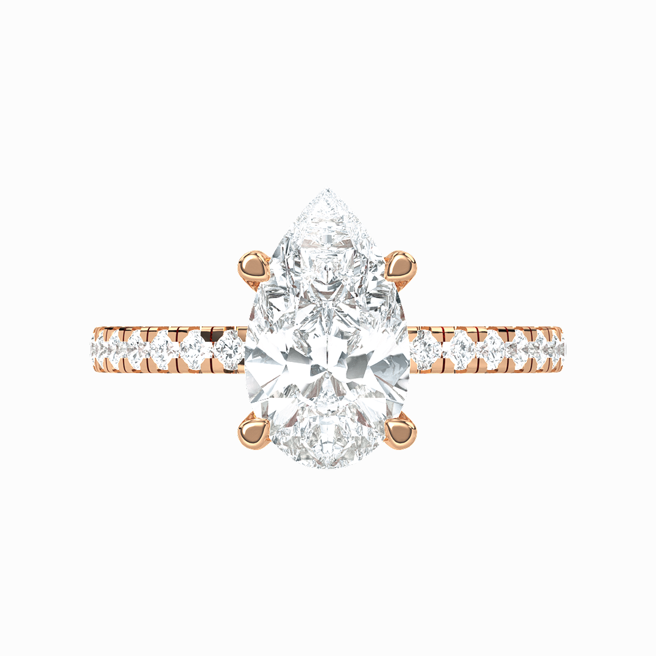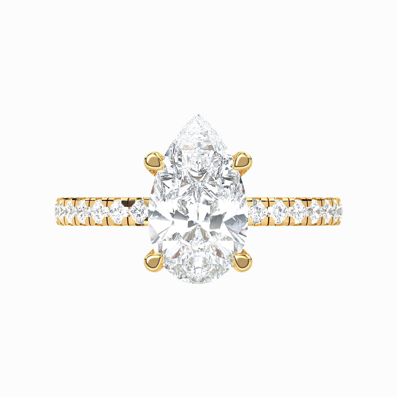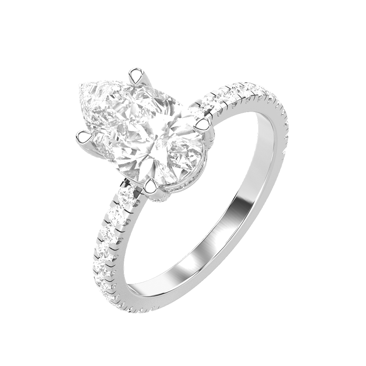 Carat Weight Total: 3.91 carats Metal: 14K White/Yellow/Rose Gold Average Width: 2.20MM Ring Style: Hidden Halo Center Stone Carat Weight: 3.12 carats Center Stone Shape: Pear Center Stone Color: F Center Stone Clarity: VS1 Center Stone Cut: Excellent Diamond Certification: IGI Certified Setting Stone Carat Weight: 0.79 carats Setting Stone Shape: Round Setting Stone Color: E–F Setting Stone Clarity: VS