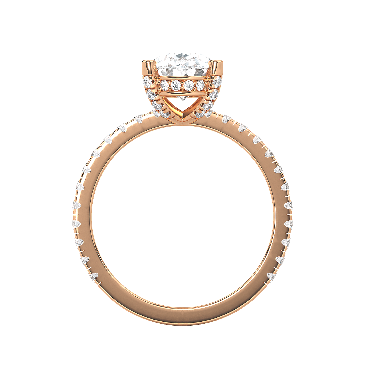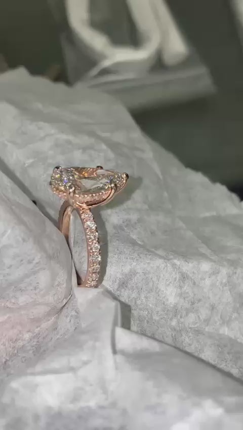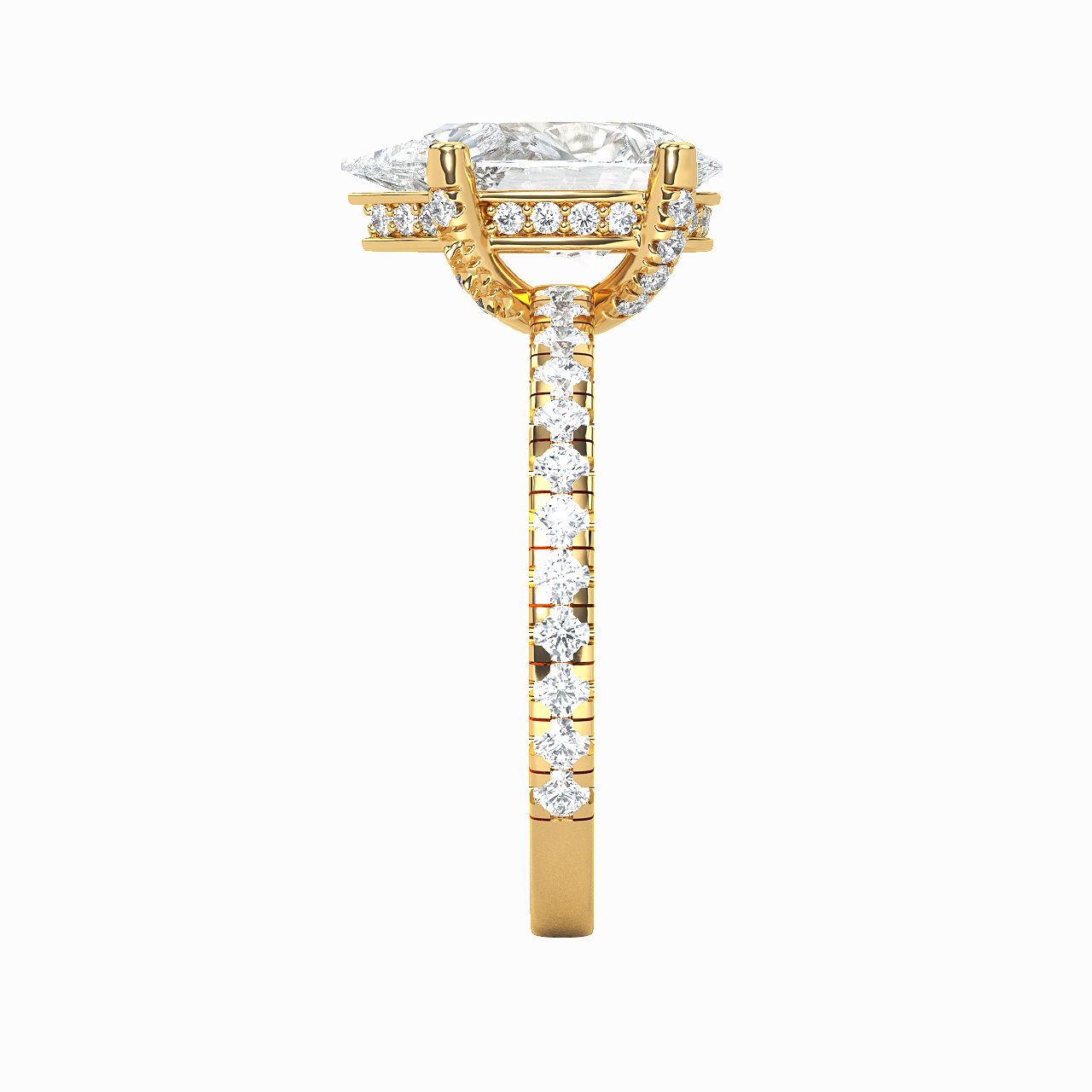 Carat Weight Total: 3.91 carats Metal: 14K White/Yellow/Rose Gold Average Width: 2.20MM Ring Style: Hidden Halo Center Stone Carat Weight: 3.12 carats Center Stone Shape: Pear Center Stone Color: F Center Stone Clarity: VS1 Center Stone Cut: Excellent Diamond Certification: IGI Certified Setting Stone Carat Weight: 0.79 carats Setting Stone Shape: Round Setting Stone Color: E–F Setting Stone Clarity: VS