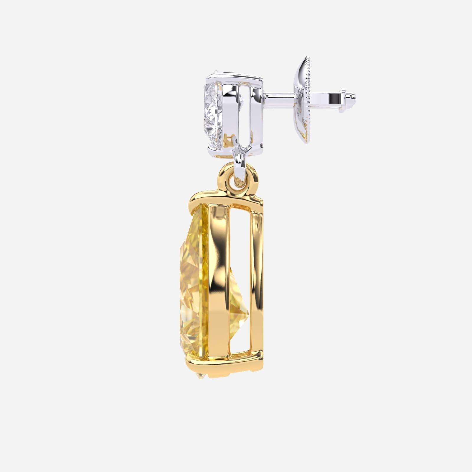 Turn heads with these stunning 6.00 CTW fashion earrings, featuring two "Excellent" cut, fancy yellow pear-shaped lab diamonds. The vibrant gems are held in 14K yellow gold baskets and dangle elegantly from 14K white gold posts. This two-tone piece offers a bold yet sophisticated look, perfect for any special occasion.