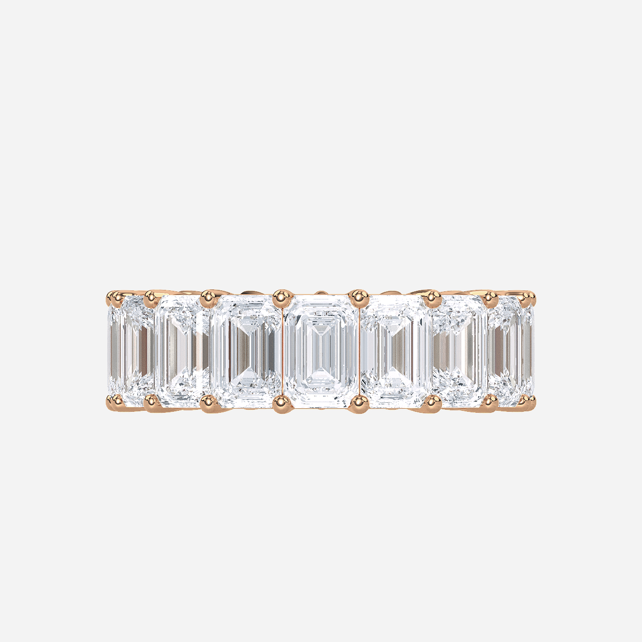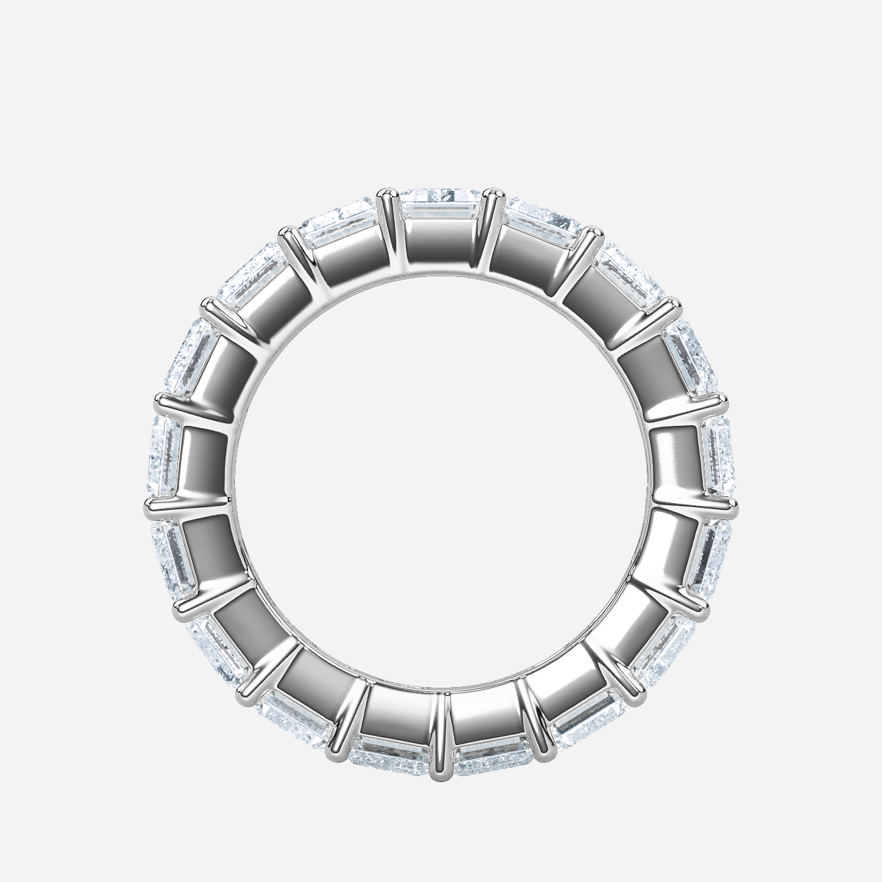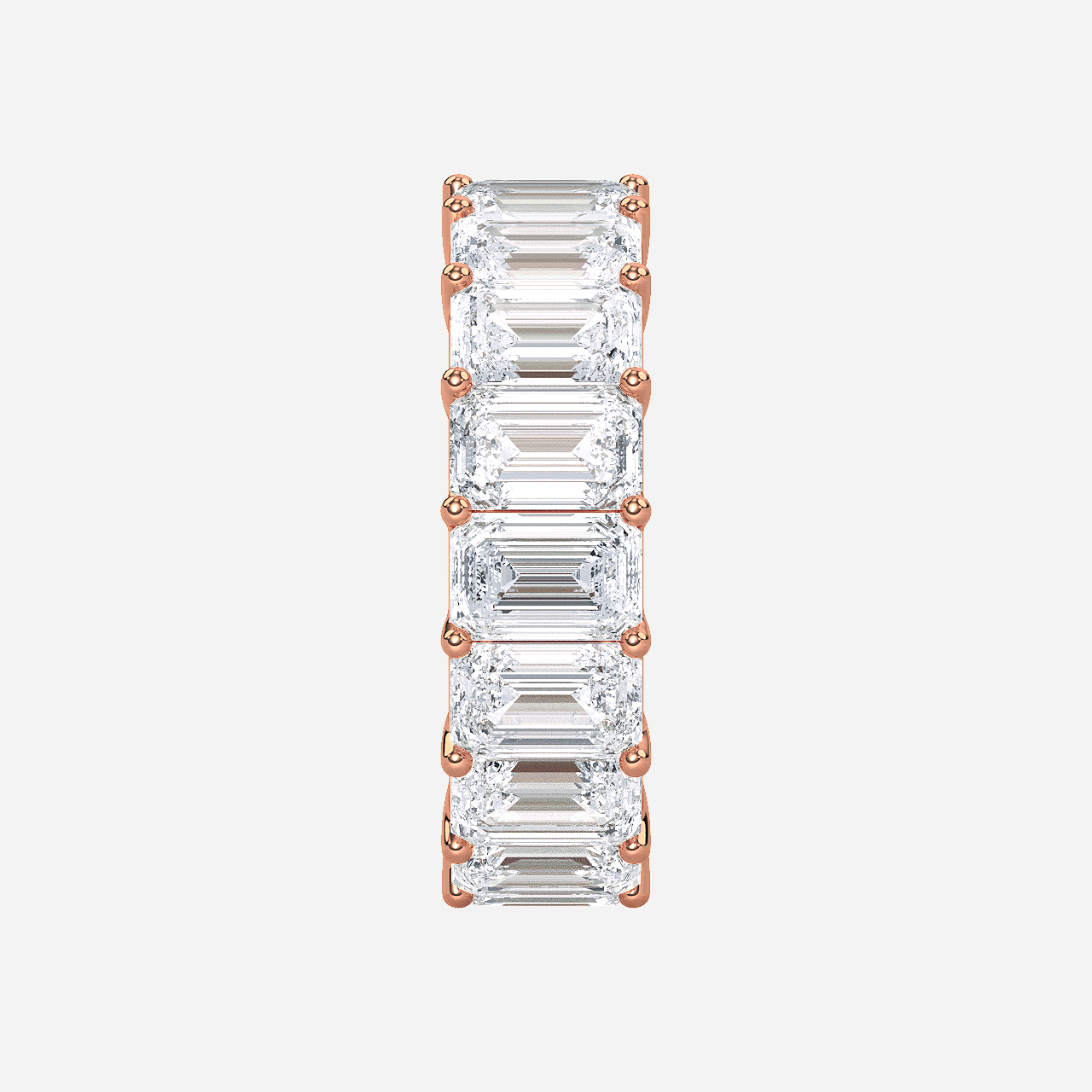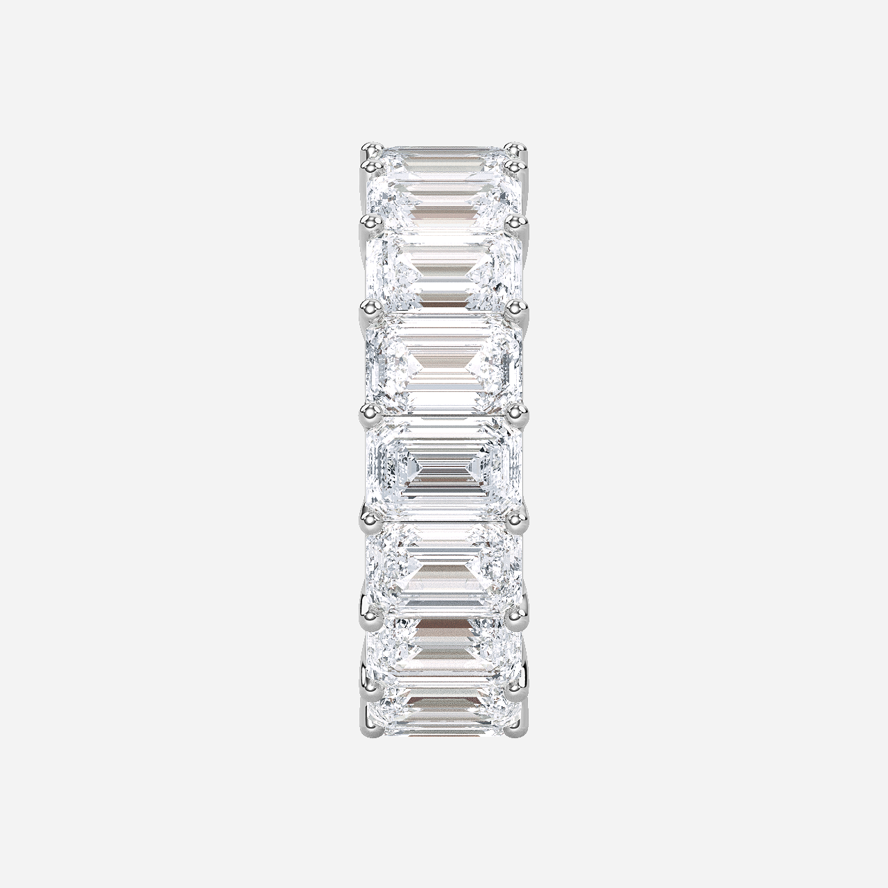 Carat Weight Total: 8.50 carats Metal: 14K White/Yellow/Rose Gold Average Width: 5MM Ring Style: Eternity Ring Center Stone Cut: Excellent Setting Stone Carat Weight: 0.50 carat each No. of Setting Stone: 17 pcs Setting Stone Shape: Emerald Setting Stone Color: E–F Setting Stone Clarity: VS